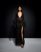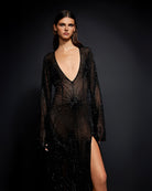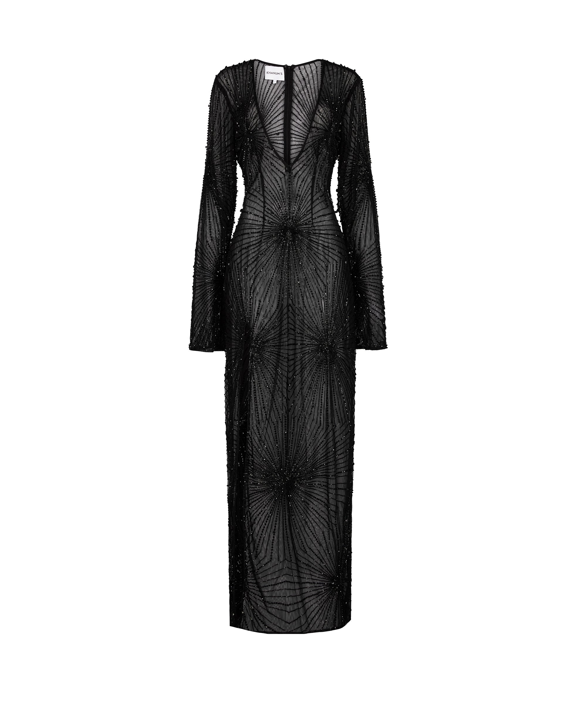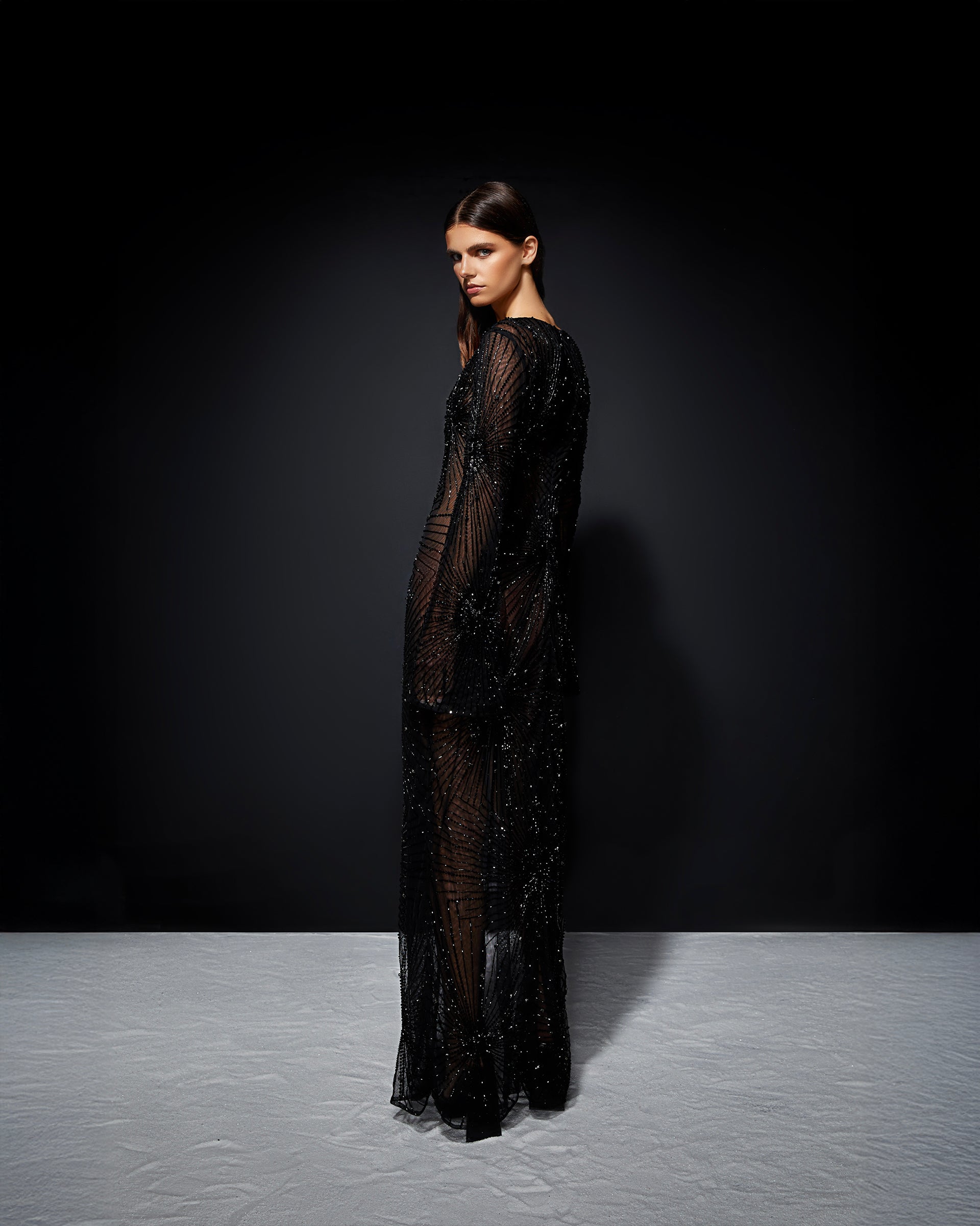 This Khanum's gown is timelessly elegant, so you'll always look back at photos of your event with confidence in your choice of outfit. It's cut from black mesh double lined with flared sleeve and has sparkling embellishment decorating the garment adding glamour to each step taken.