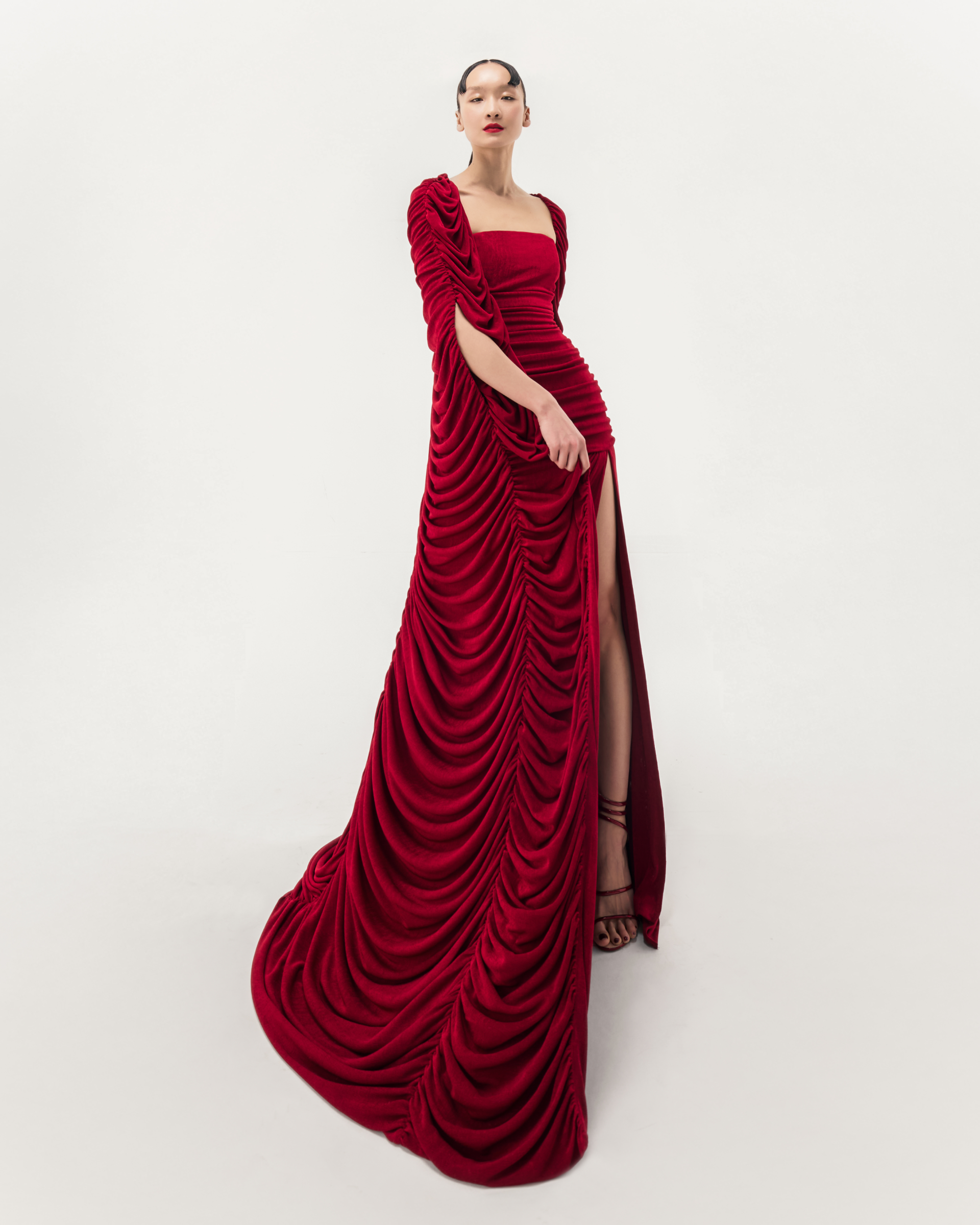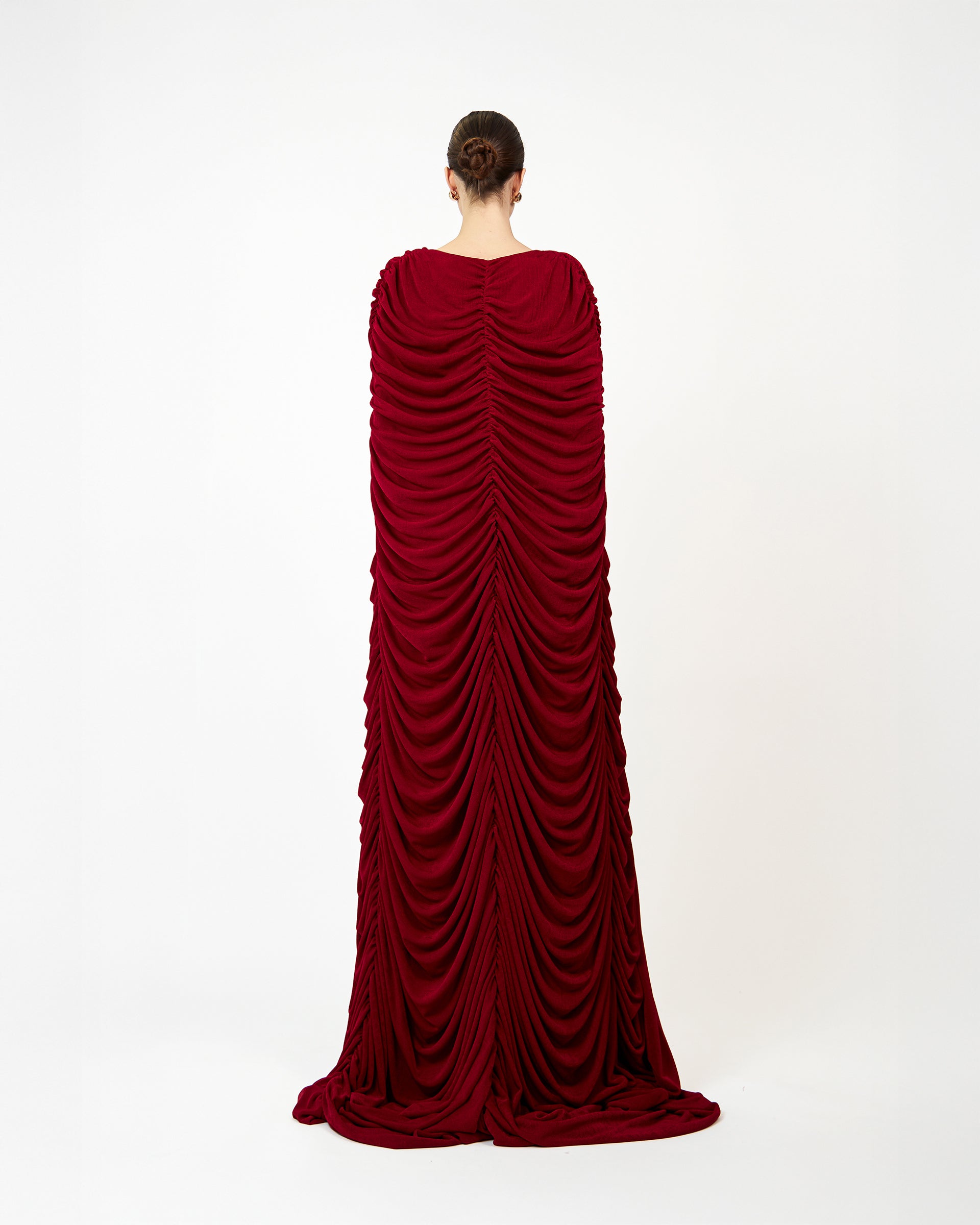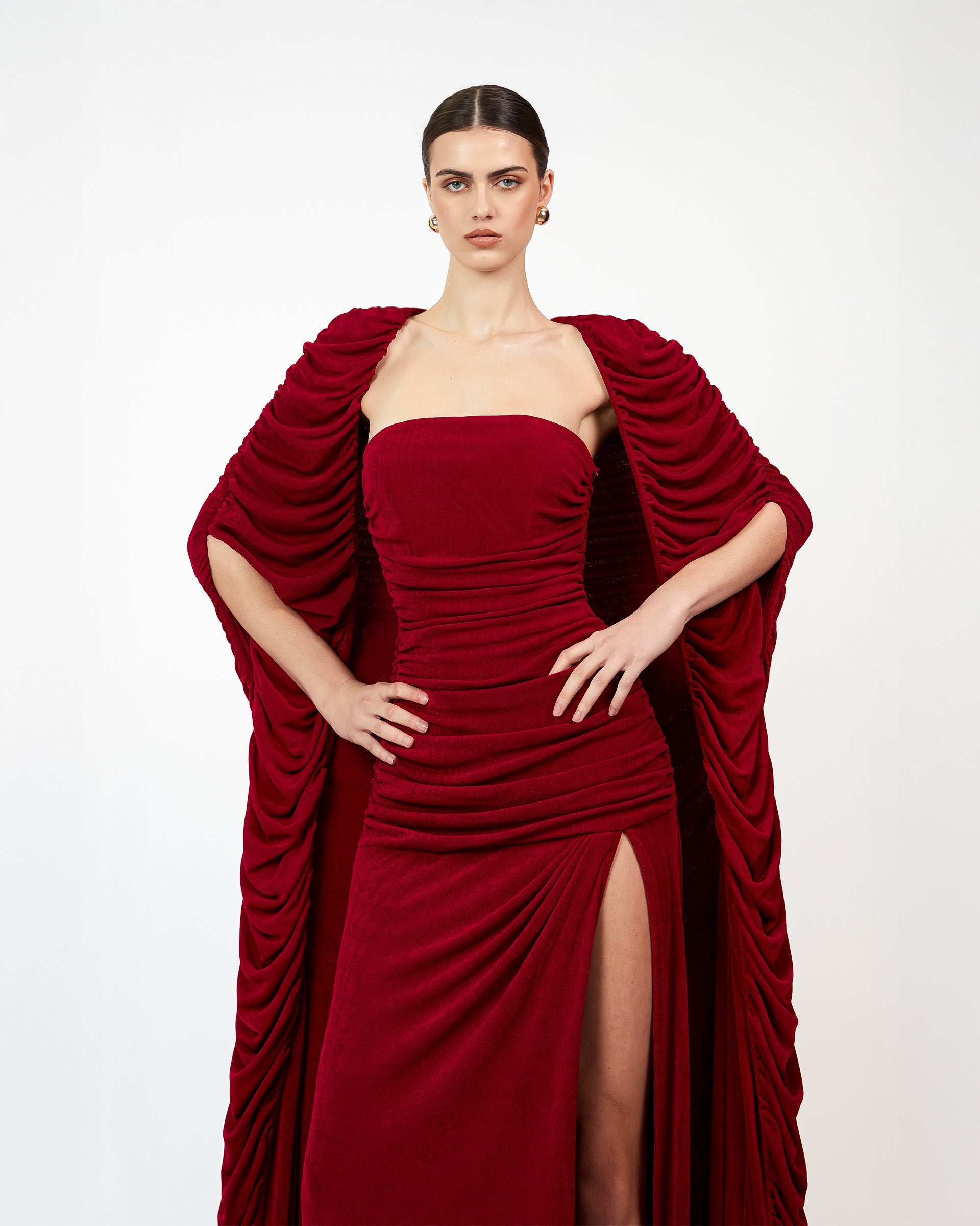 The Kathena Cape is the epitome of elegance and drama, designed to elevate any look with its breathtaking presence. Crafted with luxurious fabric, this floor-length cape features intricate gathering and ruching throughout, creating a beautifully textured silhouette that flows with every step. The Kathena is the perfect complement to our Keleste Dress, adding an extra layer of sophistication and allure for those moments when you want to make a show-stopping entrance. With its fluid movement and impeccable design, Kathena transforms any evening into an unforgettable experience.