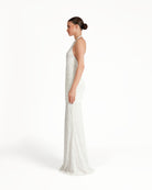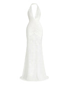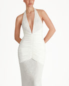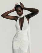 The Kaylin Dress in white exudes refined sophistication, featuring a flattering V-neckline and a gathered velvet waist that beautifully cinches the silhouette. Crafted from sheer velvet burnout mesh with a soft mesh lining, the dress offers a sumptuous texture and subtle, elegant shimmer. Perfect for glamorous evenings, cocktail affairs, or stylish day-to-night occasions, the Kaylin Dress balances modern allure with timeless elegance.
