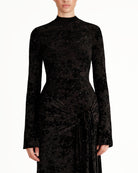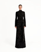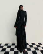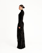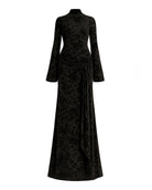 The Keli Maxi Dress embodies sophisticated luxury, with a fitted maxi silhouette and a high turtleneck that exudes modern elegance. Long sleeves and a delicately tied front sash create an exquisite drape, while the sheer velvet burnout mesh with soft mesh lining adds sumptuous texture and a subtle, ethereal allure. Designed for gala evenings, exclusive soirées, or red-carpet-worthy moments, this dress marries contemporary glamour with timeless refinement.