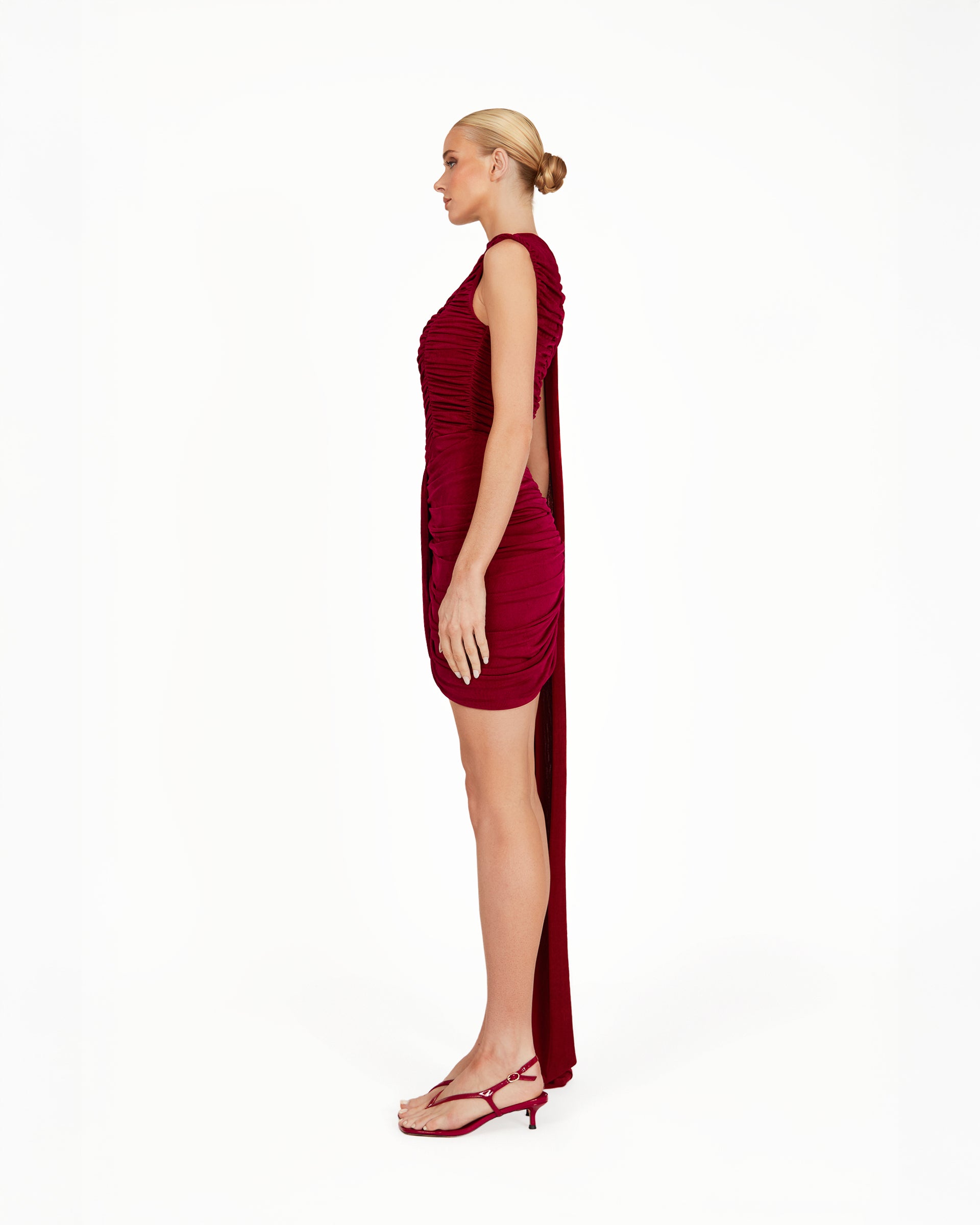 Introducing the Kemmiye Mini Dress in red, a perfect blend of modern elegance. Made from luxurious fabric, this sleeveless mini dress features a softly draped scarf neckline and gathering throughout, offering graceful coverage while creating a flattering, flowing silhouette. The asymmetric neckline and textured finish add subtle interest, giving the dress a chic, contemporary feel. The Kemmiye Mini Dress is ideal for evening events, special occasions, or any moment you want to make a stylish impression.