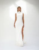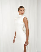 You'll want a calendar packed full of parties and events just so you can wear this Khanum's 'Kerena' wrap scarf dress. Using ivory crepe scuba, this gorgeous dress are adorned with feather trims and features a wrap over scarf. This dress is the definition of transitional and is undeniably a must have.