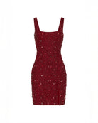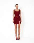 The Kerri dress is perfect for the women who are looking for something a little fun yet fabulous. Cut from burgundy soft stretch mesh, this design is embellished with crystal bugle beads and covered with diamanté's. Style yours with skinny stilettos or pumps to let everyone know, you're the woman of the show.