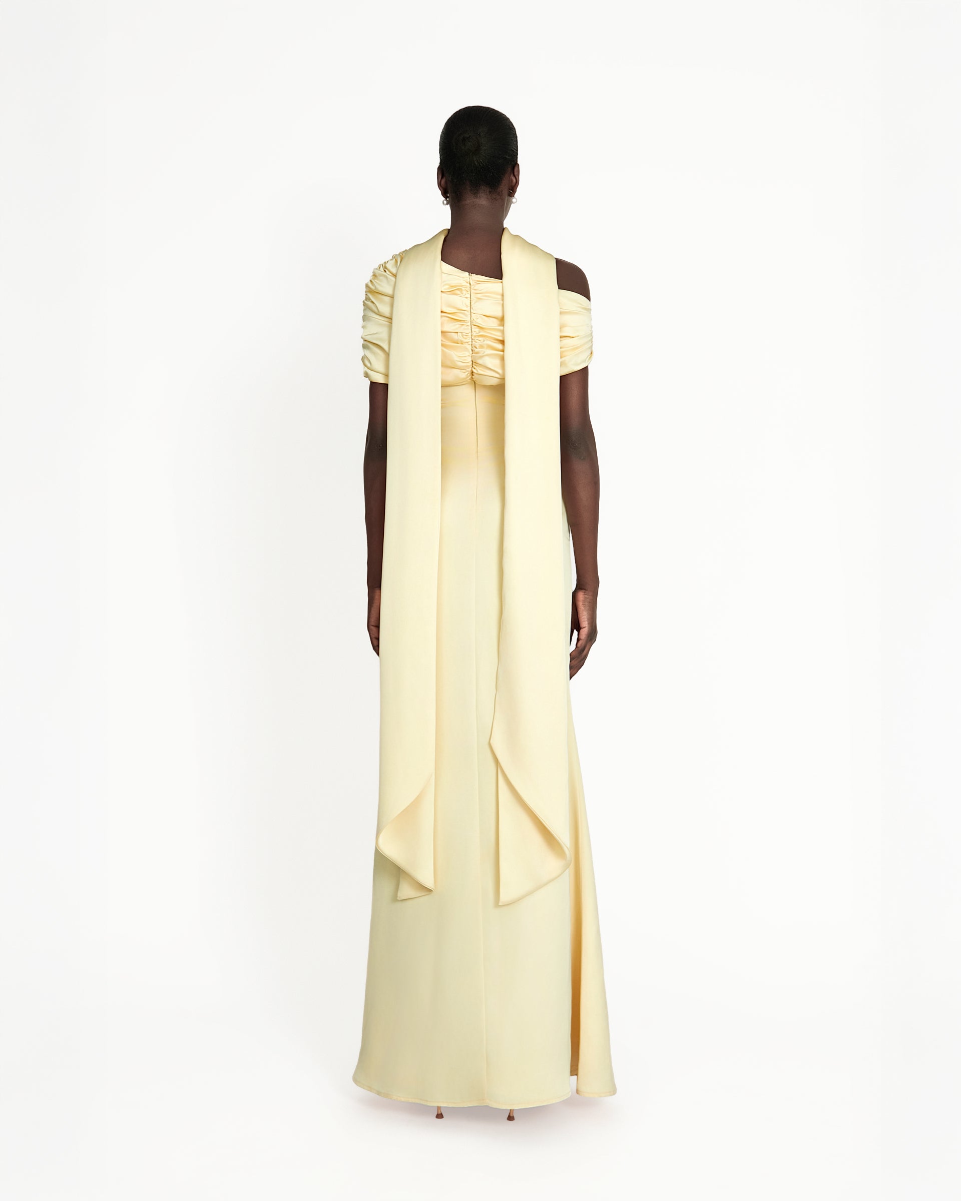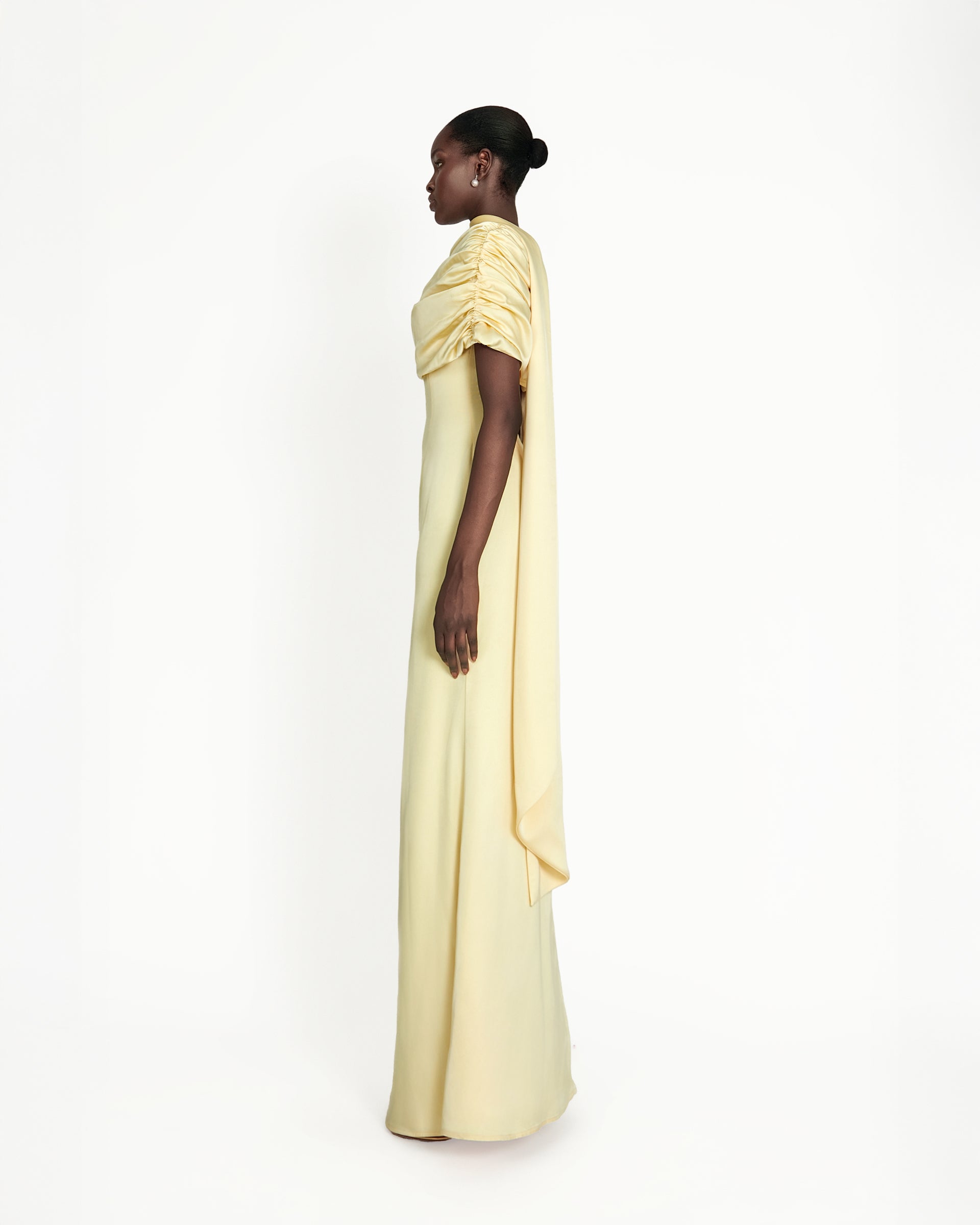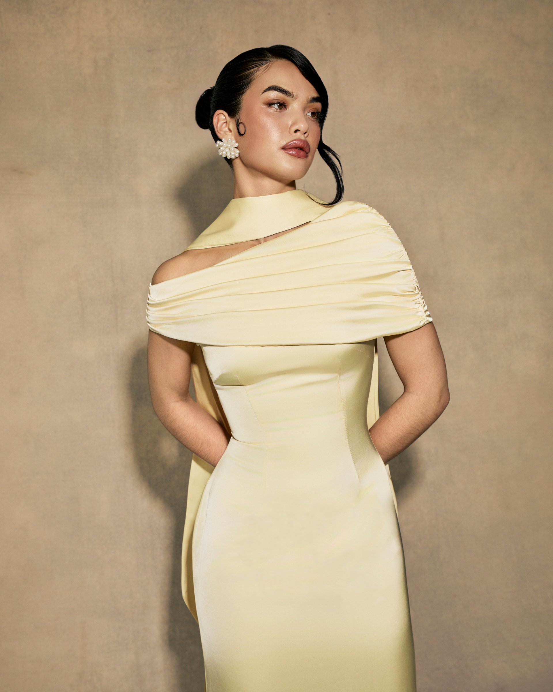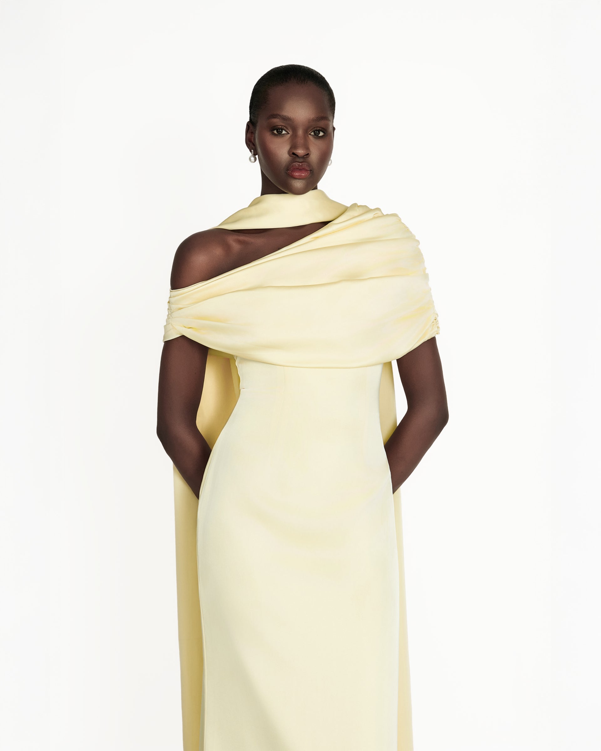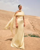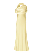 Introducing the Kiris dress in butter yellow, a perfect fusion of elegance and modern sophistication. Crafted from luxurious satin, this dress features a gathered bardot neckline that effortlessly frames the shoulders, while the soft A-line silhouette flows gracefully, creating a timeless yet contemporary look. The satin fabric drapes beautifully, offering a smooth, flattering fit that contours the body with ease. Ideal for an evening affair or a refined celebration, the Kiris dress embodies understated luxury and chic simplicity, making it a standout piece for any occasion.