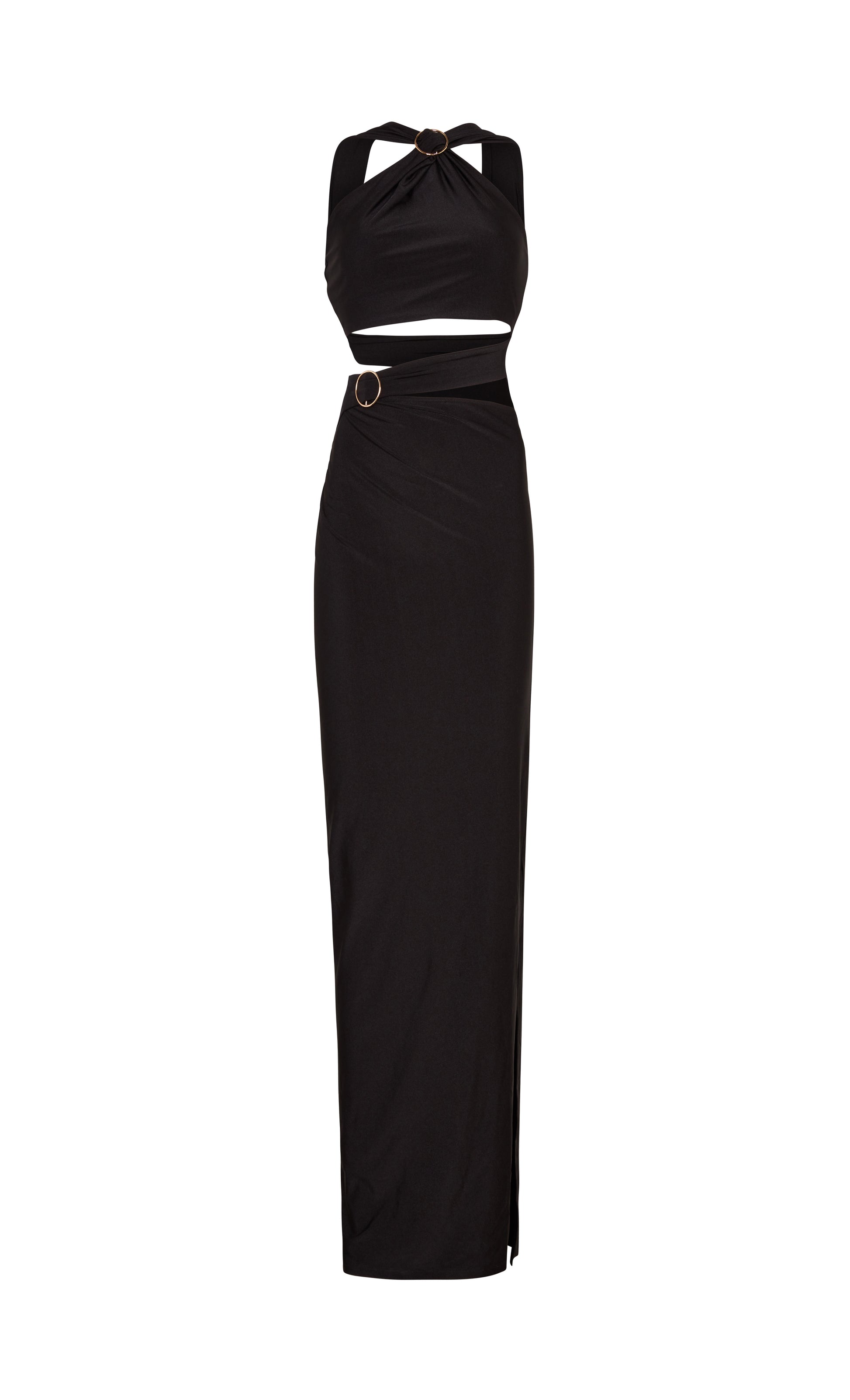 The 'Kivia' dress is made from panels of double lined lycra that are wrapped to create beautiful design. Designed for a figure-hugging fit, it has a halterneck, gold buckles and cutouts that reveal subtle peeks of skin.
