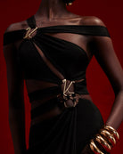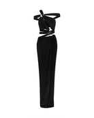 This ones a Team Khanum's favourite. The cut, the colour, the detailing? This Kiyren dress is sure to make a statement wherever and however you choose to wear it. Cut from slinky textured jersey with strappy details, it's detailed with our Khanum's Gold K Buckle. Style yours with bold gold accessories to finish the look. Wear with warning: heads will turn and jaws will drop.