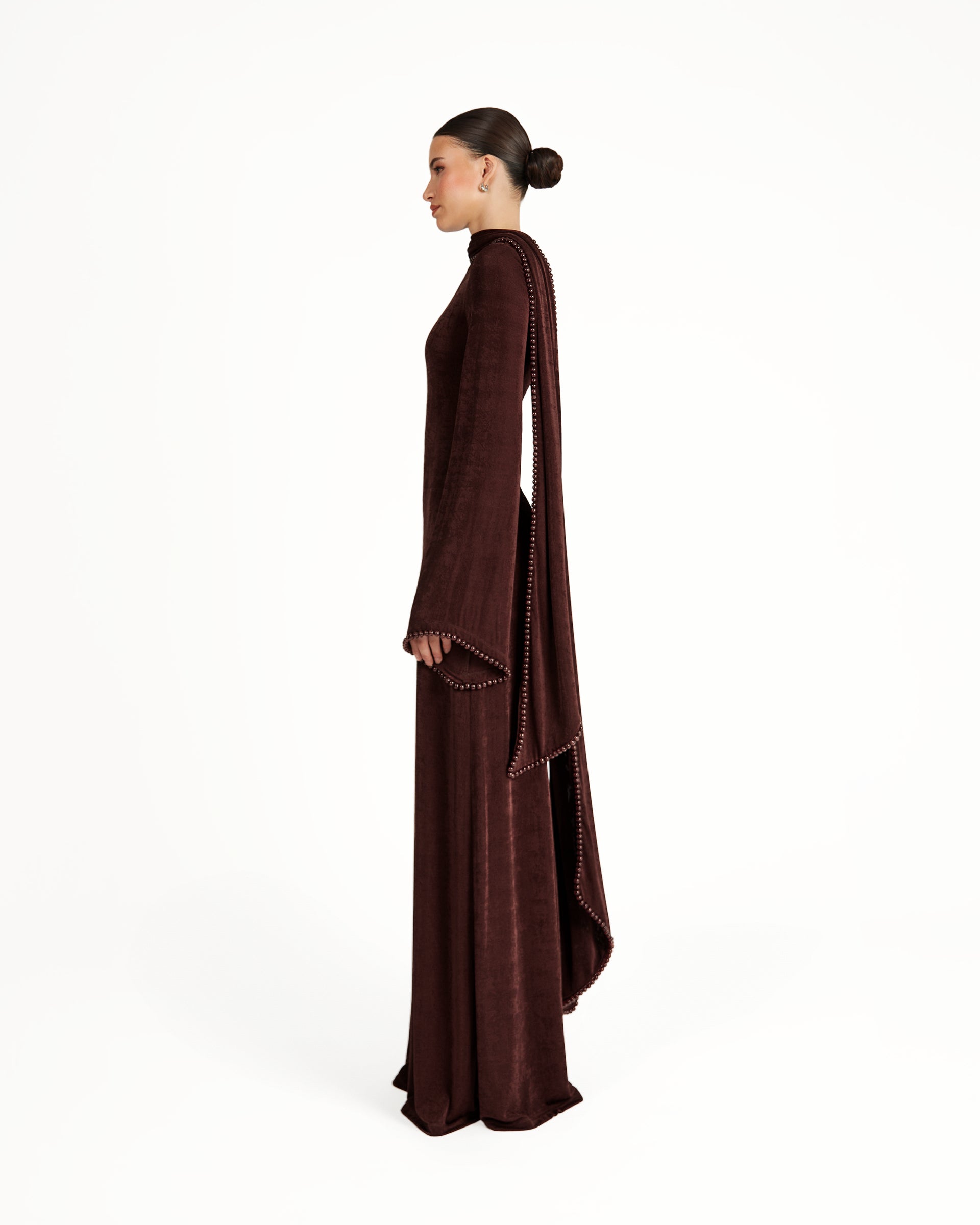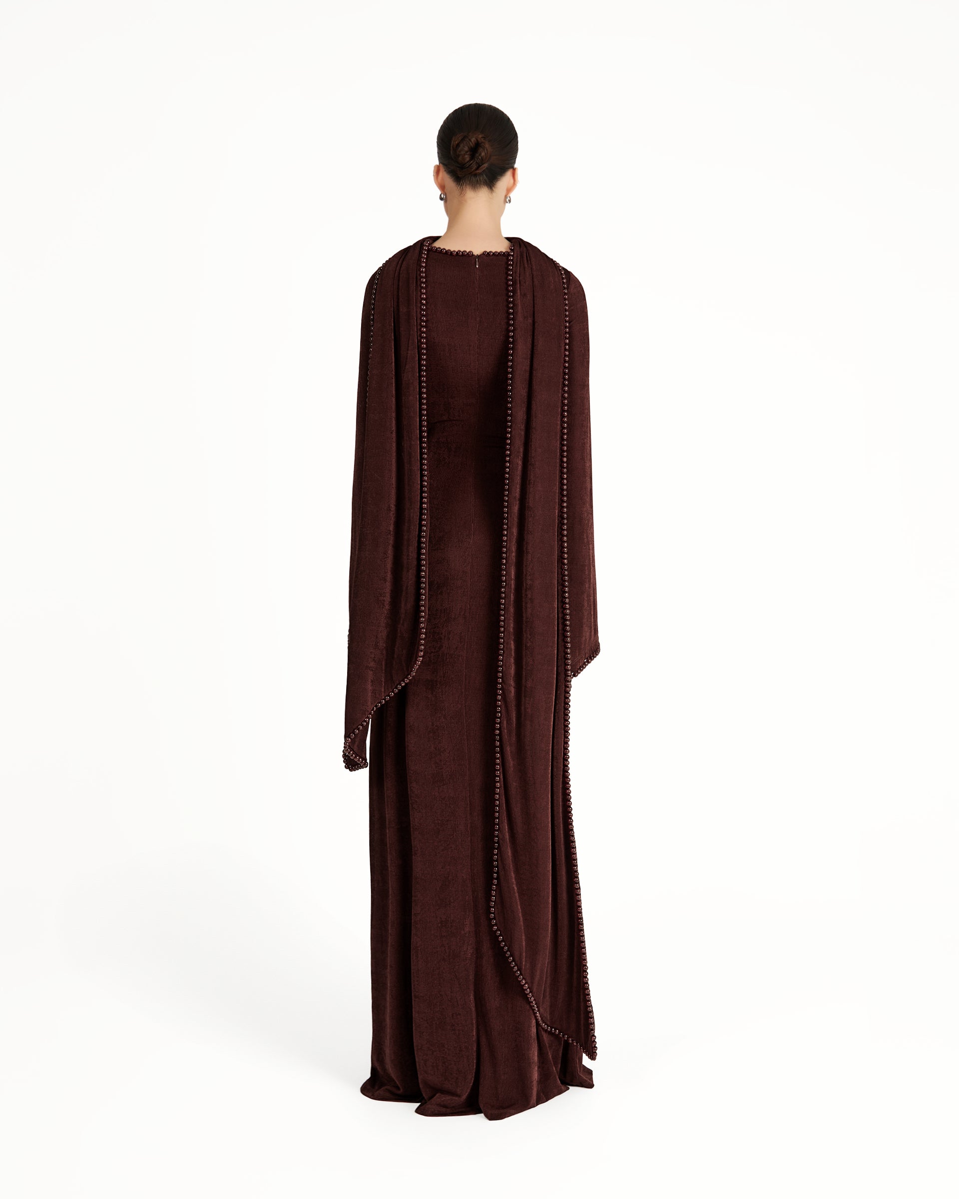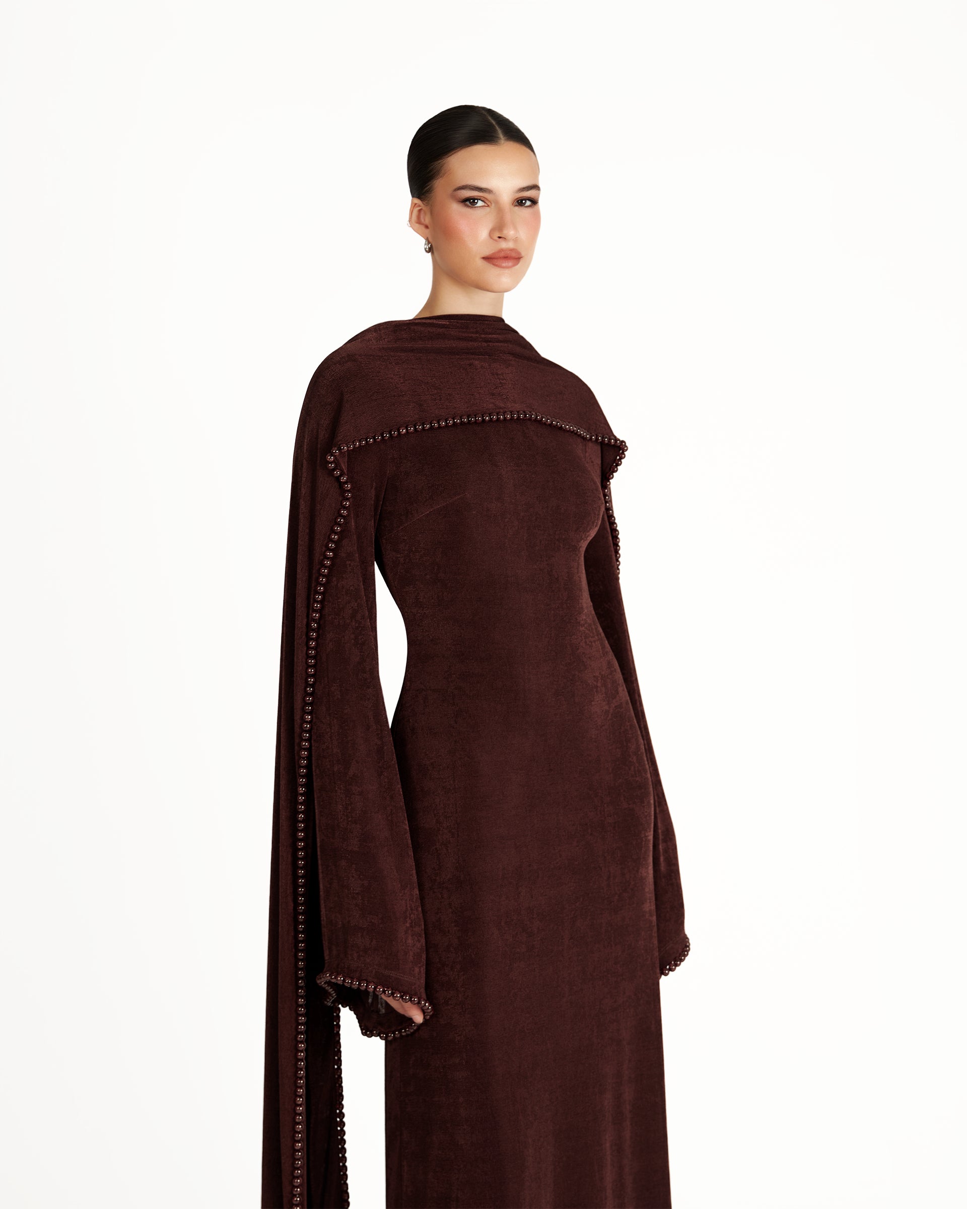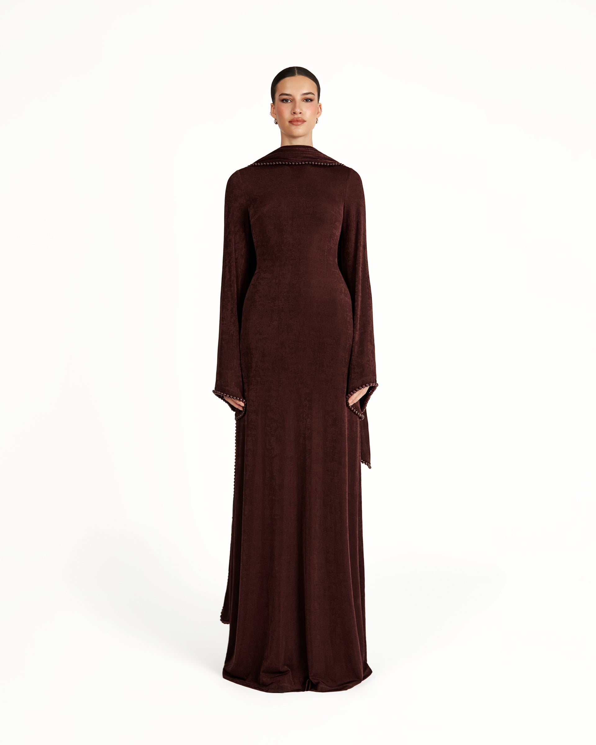 The Kryce dress is the epitome of timeless elegance and refined beauty. Crafted from slinky textured it features slightly flared sleeves and an A-line silhouette that skims the figure perfectly. The attached scarf is finished with a delicate pearl trim, imparting a touch of exquisite luxury. Pair with heels to allow the floor-length hem to sweep with poise and grace.