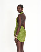 The Kumta Dress is the essence of modern sophistication and artisanal detail. Made using stretch power mesh, it features a v neckline that beautifully frames the silhouette. Intricately embellished with rhinestones, bugle beads, and pearls, this fitted and structured dress is accented by ruched cowl detailing at the hip for a flattering finish. Crafted to combine exquisite craftsmanship with refined elegance, this dress is perfect for unforgettable evenings. Pair it with statement heels and delicate accessories to complete a look that commands attention and exudes confidence.
