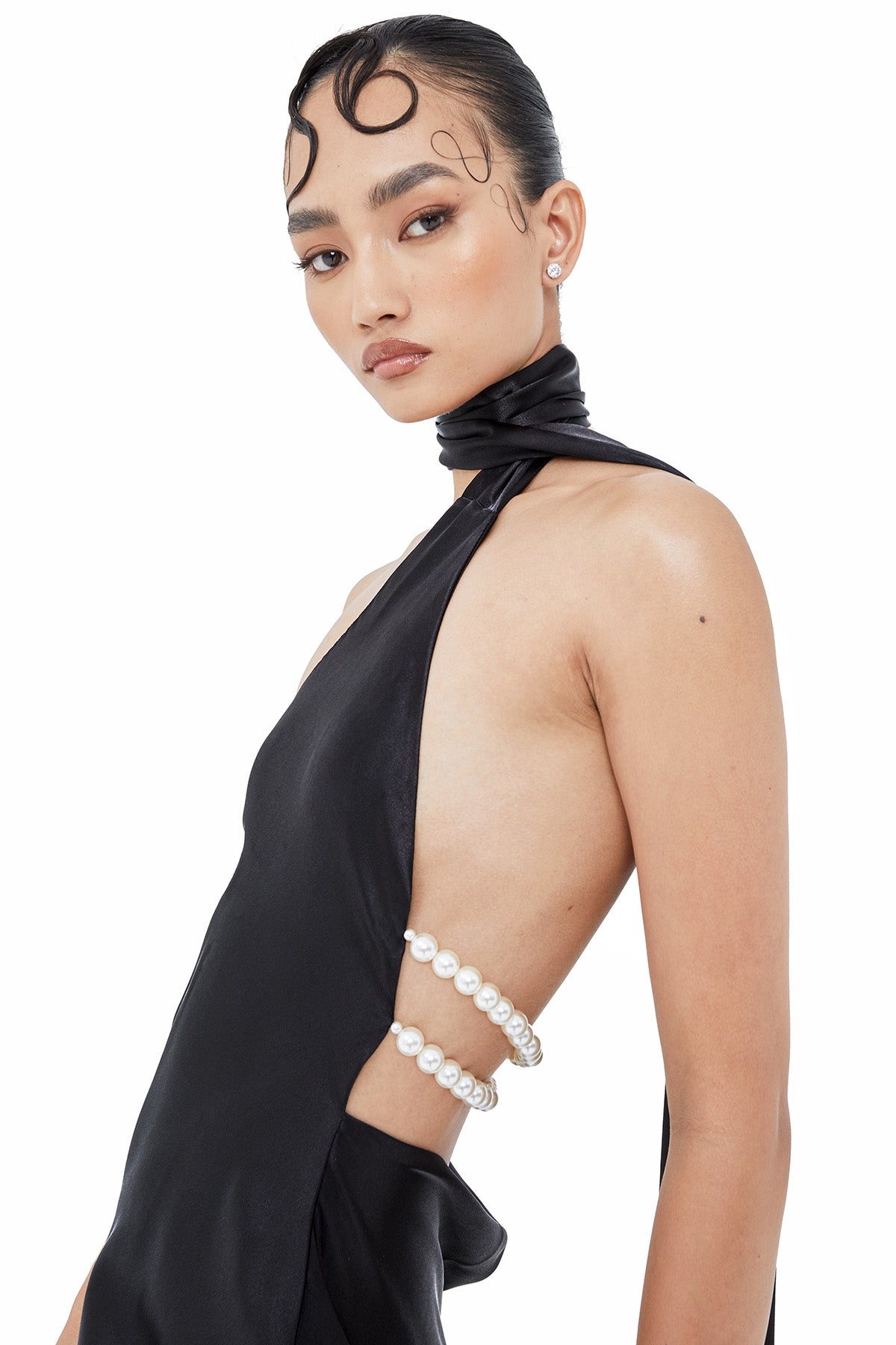 Suitable for any occasion, Kushi is just enough to make jaws drop. The fluidity of the silk satin fabric is elevated by the low back supported by the pearl rope detail. The draped design is defined by our scarf accent, a perfect final touch that ties the look together.