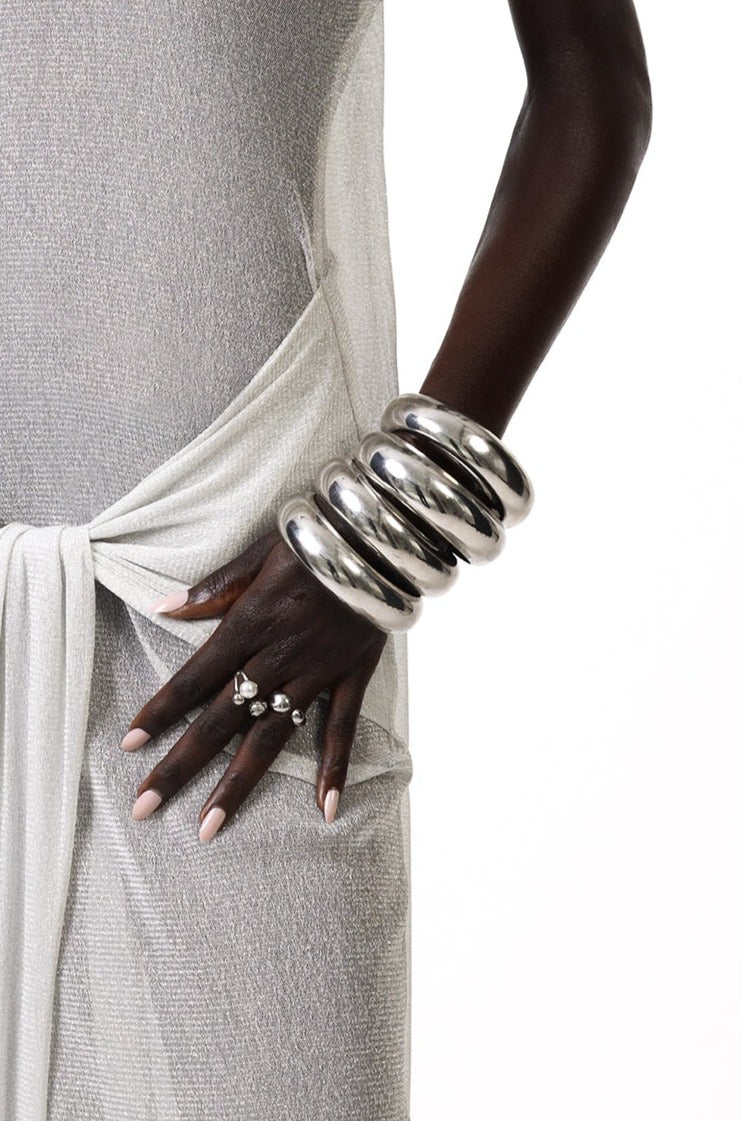 The key to a perfect wrist stack is mixing different styles - team this smooth bangle with chunky chains or better yet, more bangles. It's detail free and is made from silver tone metal. You'll have the timeless piece in your jewellery box for years to come.